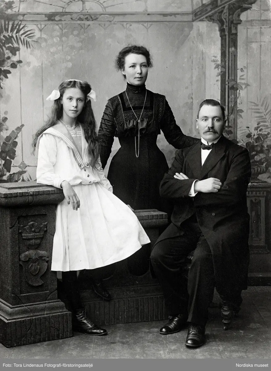 Familjeporträtt. Medelålders kvinna i mörk klänning med veckade långa ärmar, broderier och hög krage. Flicka i yngre tonåren i ljus klänning med sjömanskrage. Medelålders man med mustach i mörk kostym, skjorta med ståkrage och fluga.