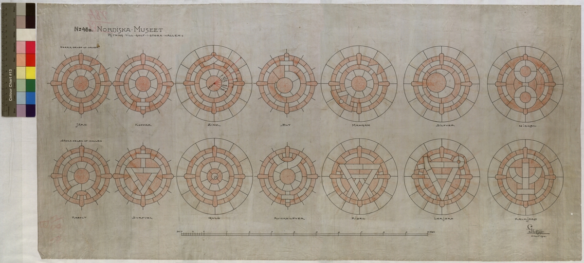 Ritning på väv över Nordiska museets huvudbyggnad. Ritning till golv i Stora hallen. Nedre delen av hallen: Järn, Koppar, Zink, Bly, Mangan, Silver, Nickel. Södra delen av hallen: Kobolt, Svavel, Guld, Kvicksilver, Kisel, Lerjord, Kalkjord. Cirkelsymboler för varje ämne. Plan. Stengolv, stora hallen. 46x 97 cm.Tusch och brun krita. Linjalritning. I Gust Clason 23 april 1899.