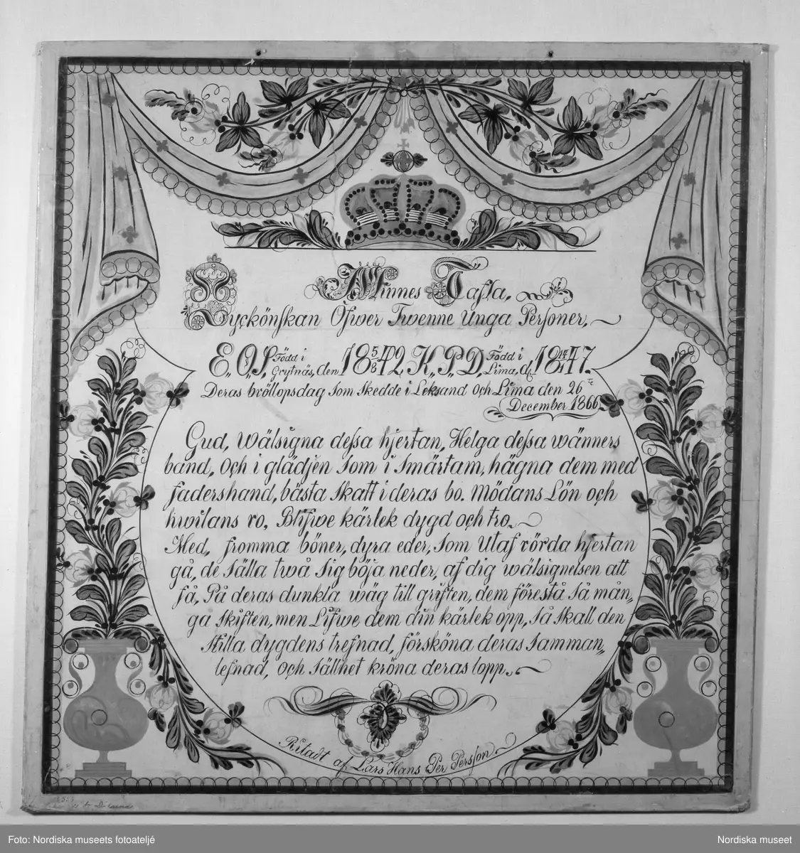 Minnestavla målad av Larshans Per Persson 1866 till bröllop. Nordiska museet inv.nr 12525.