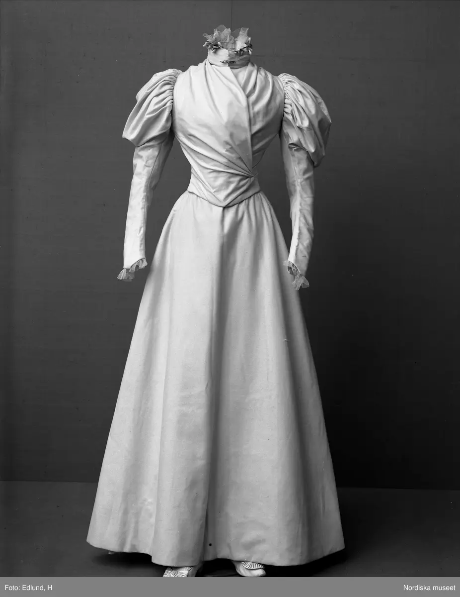 Bröllop. Brudklänningar som tillhört Augusta Torpadie, f. Linge. "En med denna identisk bruddräkt tillhör Nordiska museet: inv nr 186044a-b"