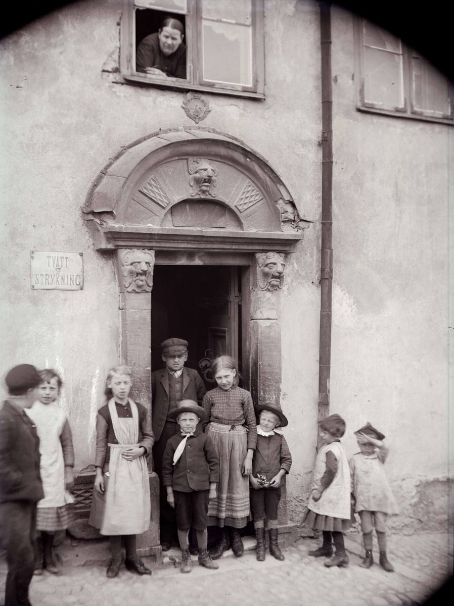 En samling barn framför en port och en kvinna som tittar fram i ett fönster ovanför. Väggskylt med text "Tvätt Strykning". Kvarngatan 31, kv Brandmästaren, nuvarande Artillerigatan 41, Stockholm. Porten är enligt Ny Illustrerad tidning 14 januari 1871 "prydt med lemningar från Dramatiska Teatern." Ovanför porten sitter ett brandförsäkringsmärke.