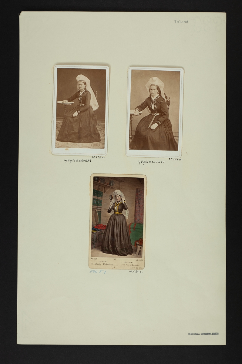Ark med tre monterade foton. Studioporträtt av kvinnor från Island i folkdräkt/högtidsdräkt.