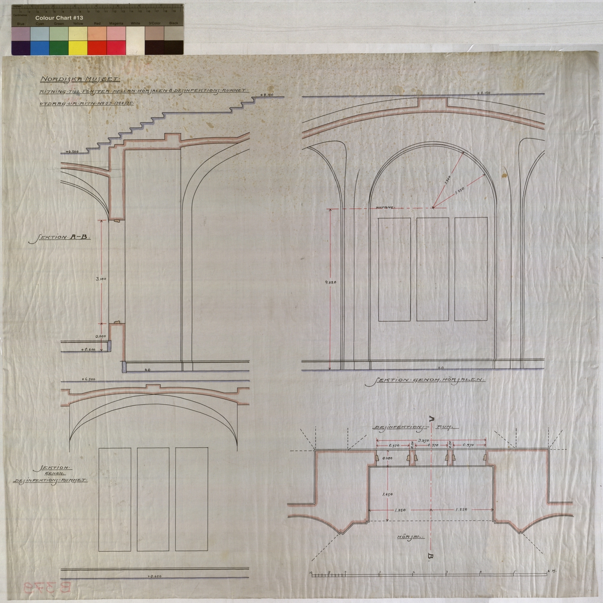 Ritning på väv över Nordiska museets huvudbyggnad. Ritning till fönster mellan hörsalen och desinfektionsrummet. Utdrag ur ritning No 53. 134 o 135. Sektionsritning. Planritning. Tusch, rött, gult, blått, brunt. Linjalritning. Osignerad.
