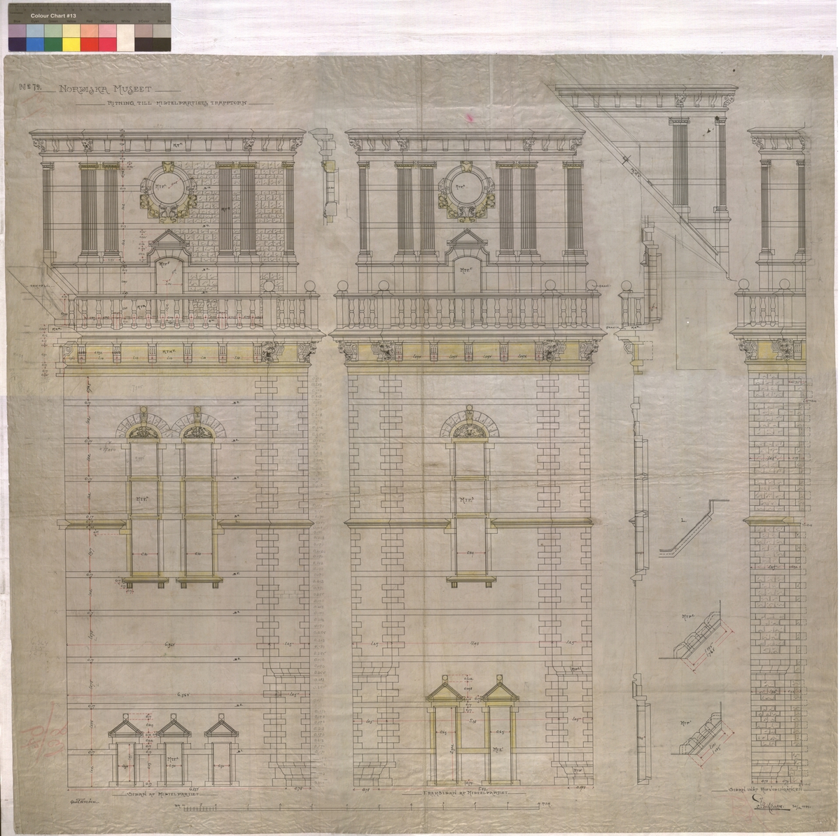 mittenpartiets trapptorn. Fasad.Stora portens trapptorn. 96,5x105 cm. Tusch, rött och gul färgpenna. Linjalritning, fri hand. I Gust Clason 30/12 1899. Gust Améen.