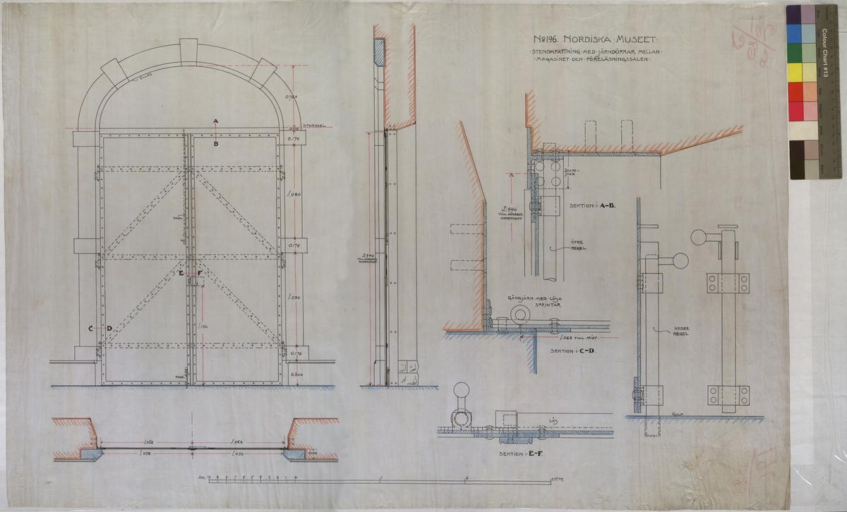 Ritning på väv över Nordiska museets huvudbyggnad. Stenomfattning med järndörrar mellan magasinet och föreläsningssalen. Elevation. Dörr och jordvåning. 59x 91,5 cm. Tusch, rött och blått. Linjalritning. Osignerad.