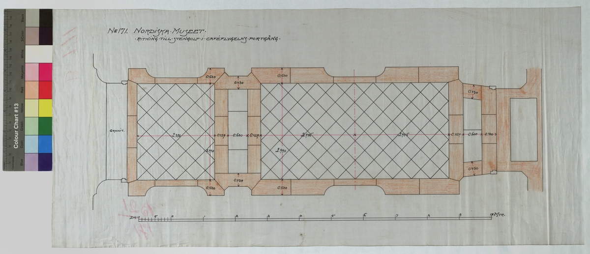 stengolv i caféflygelns portgång. Plan. Golv, södra porten och jordvåning. 30x66 cm. Tusch, rött, brun färgpenna. Linjalritning. Osignerad.