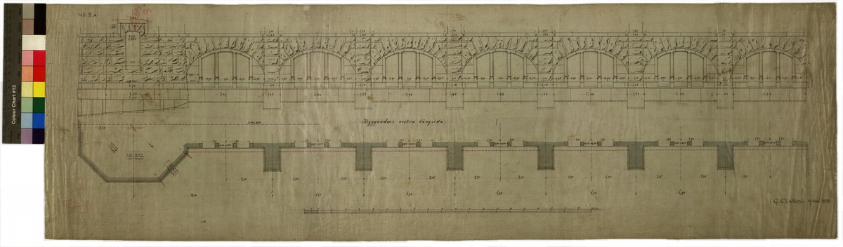 Ritning på väv över Nordiska museets huvudbyggnad. Fasad. Sockel. Fönster.34,5x115 cm. Tusch, rött, grått Linjalritning. Fri hand. I G Clason 19 febr 1892.