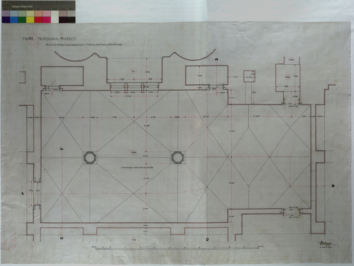 läsningssalen i mittenpartiets jordvåning. Cementgolv med linolleum-matta. Plan. Föreläsningssal. 65x94 cm. Tusch, rött, brunt, grått, gult. Linjalritning. I Gust Clason 31 mars 1905.