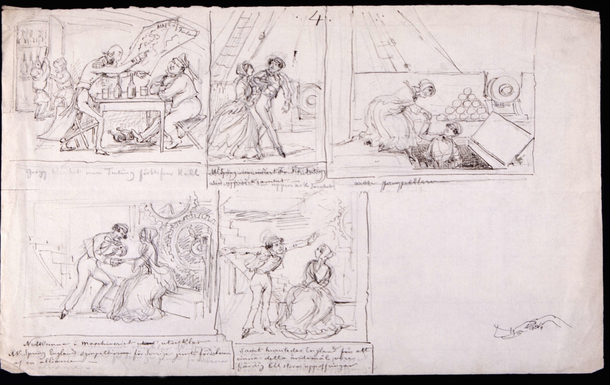 Serieteckning om familjen Tuting. Tuschteckning av Fritz von Dardel