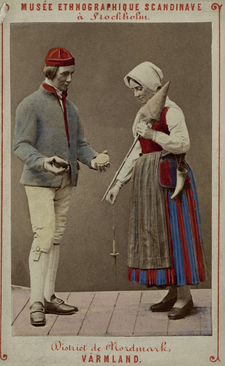 Handkolorerat fotografi av man och kvinna i sockendräkter från Nordmark, Värmland. Skandinavisk-etnografiska samlingen, Stockholm.