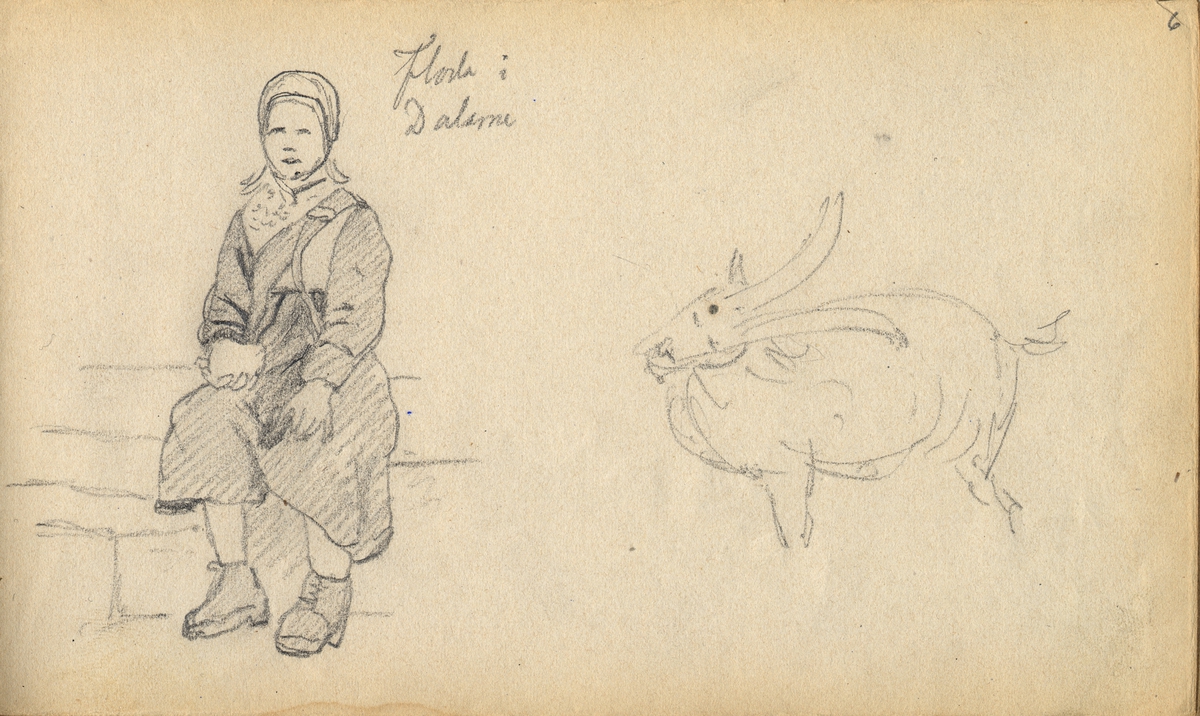 Blyertsskiss. "Floda i Dalarna". Flicka i folkdräkt och get. Ur Skissbok "Album" av A. J.G. Virgin