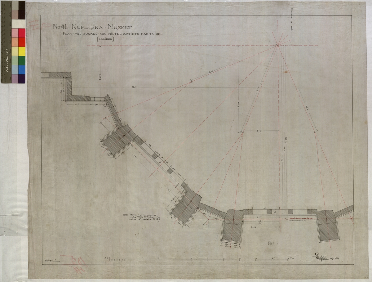 Ritning på väv över Nordiska museets huvudbyggnad. Plan till sockel för mittenpartiets bakre del [absiden]. Plan. Sockel, absiden. 68x 84 cm. Tusch och rött. Linjalritning. I Gust Clason 25/1 1899. Gust Améen.