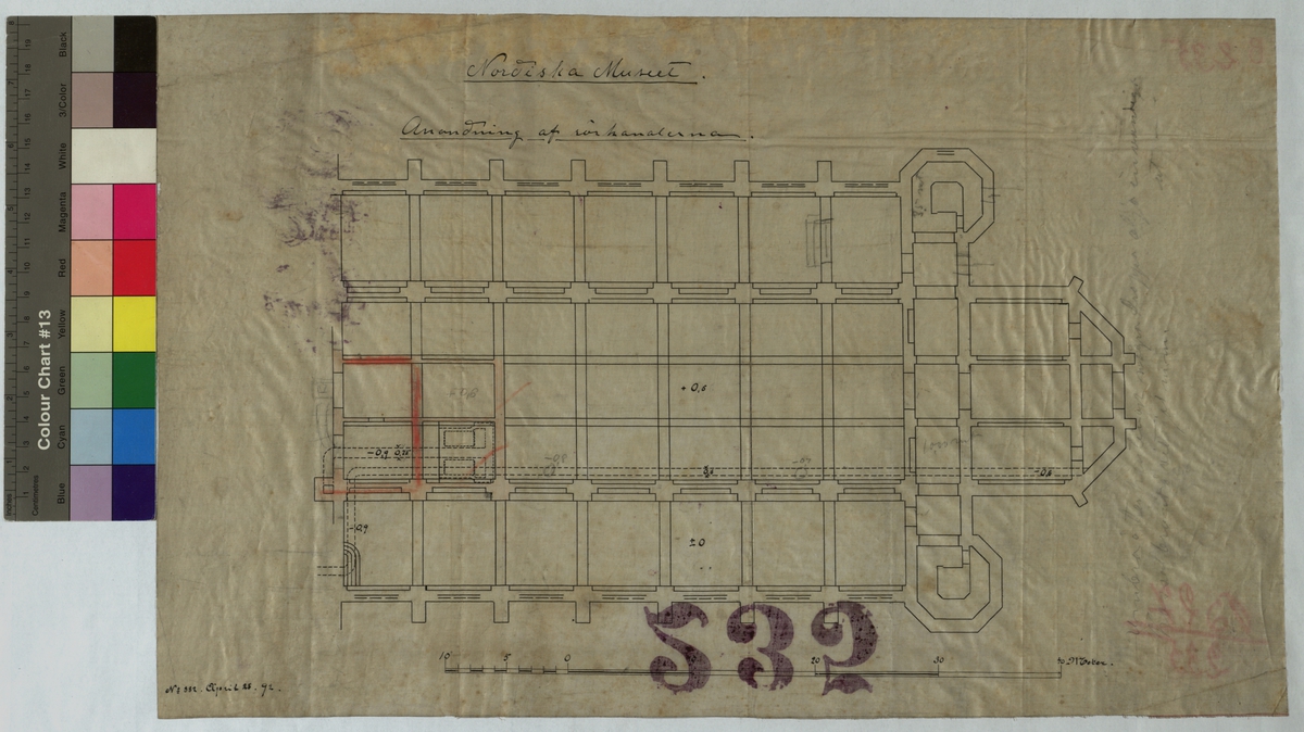 Anordning av rökkanalerna. Installationsritning, rörkanal. 28x45 cm. Tusch, rödkrita. Linjalritning. No 882 april 28 92. Osignerad.