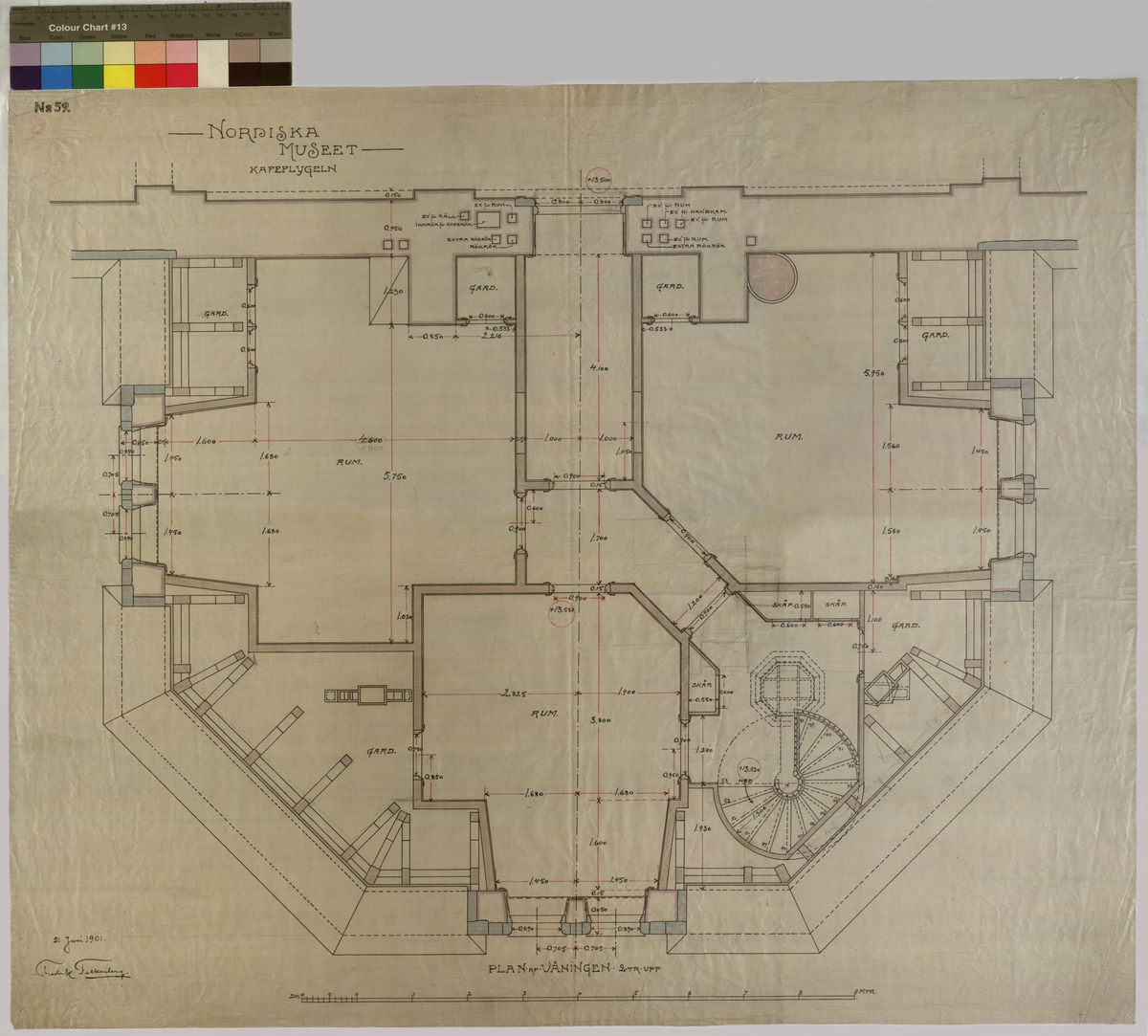 Ritning på väv över Nordiska museets huvudbyggnad. Kafeflygeln. Plan av våningen 2 tr upp. Plan. Kafébygnaden, entresolvåningen och Göranssons lägenhet. Tusch, rött, brunt och grått. Linjalritning. 21 juni 1901 Fredrik Falkenberg.