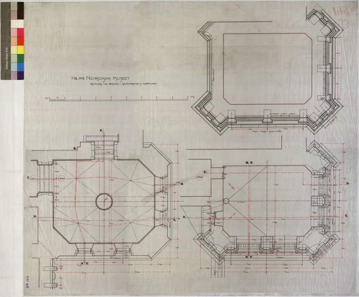 planer i Mittenpartiets trapptorn. Plan. Trapptorn, mittpartiet. 77x 87 cm. Tusch, rött, brunt, gult och grått. Linjalritning. Osignerad.