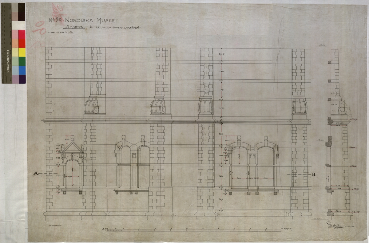 Ritning på väv över Nordiska museets huvudbyggnad. Absiden. Nedre delen över graniten ( Kyrksalens mått). Fasad. Absiden. 60x85,5 cm. Tusch, rött. Linjalritning. I Gust Clason 30 Mars 1900. A V Fagerström.