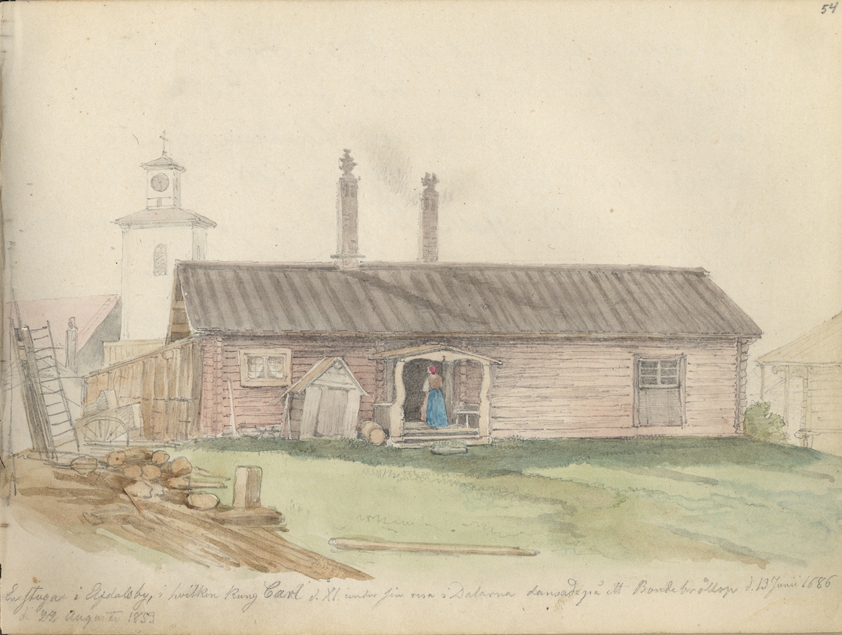 Färglagd blyertsskiss. En stuga sedd på avstånd med utsikt över gårstundet. En kvinna i dräkt på förstukvisten. Bakom stugan en kyrka. "En stuga i Elfsdalsby i hvilken Kung Carl d XI under sin resa i Dalarna dansade på ett Bondebröllop d 13 juni 1686. D 22 augusti 1853". Ur skissbok märkt G.V Palm, Nordiska museets arkiv.