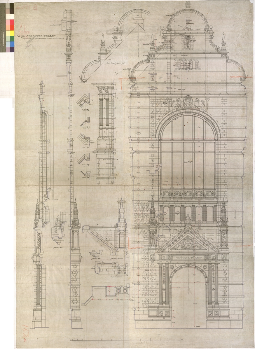 Ritning på väv över Nordiska museets huvudbyggnad. Ritning till mittenpartiets gavel och portal. Fasad. Stora porten. 141x97,5 cm. Tusch, rött och blått. Linjalritning, fri hand. Osignerad.