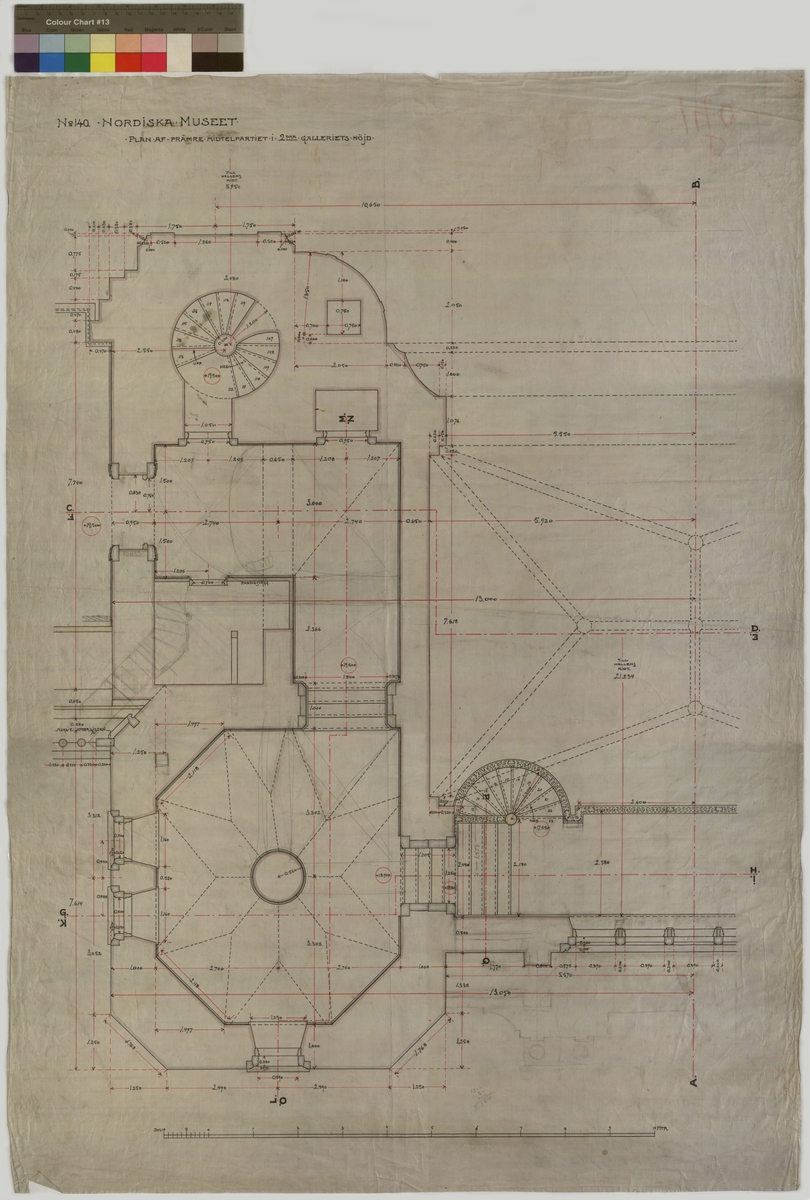 Ritning på väv över Nordiska museets huvudbyggnad. Plan av främre mittenpartiet i 2:dra galleriets höjd. Plan. Kröningsläktaren, 2:ra galleriet. 99,5x 70,5 cm. Tusch, blyerts, brunt, grått och gult. Linjalritning. Osignerad.