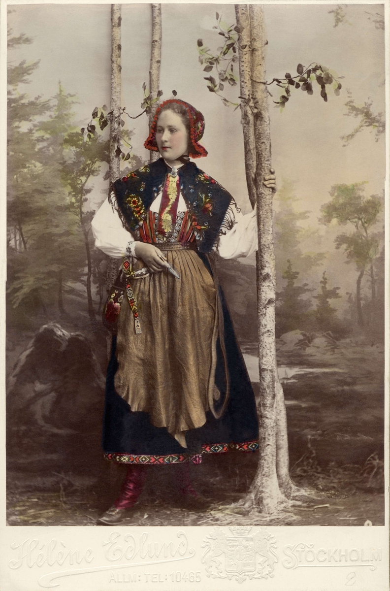Kvinna i helfigur klädd i dräkt från Floda socken, Dalarna. Handkolorerat fotografi