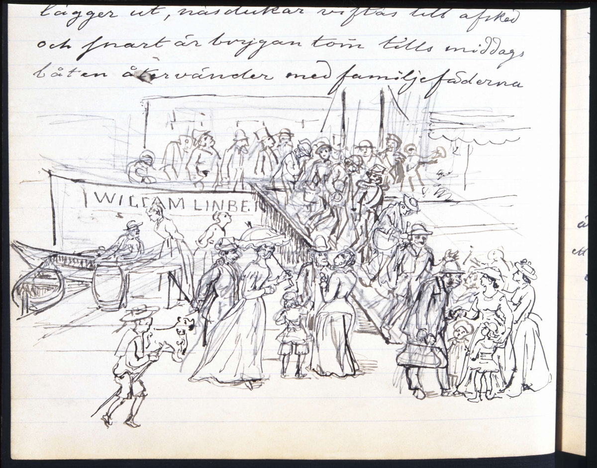 "...lägger ut, näsdukar viftas till afsked och snart är bryggan tom tills middagsbåten återvänder med familjefäderna". Tuschteckning av Fritz von Dardel, 1874.