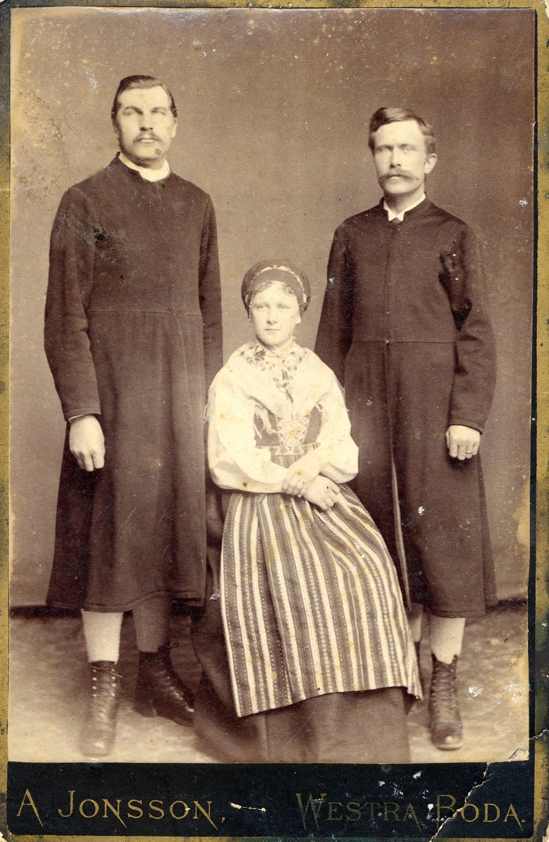 En kvinna sitter, och två män står bakom, klädda i folkdräkter