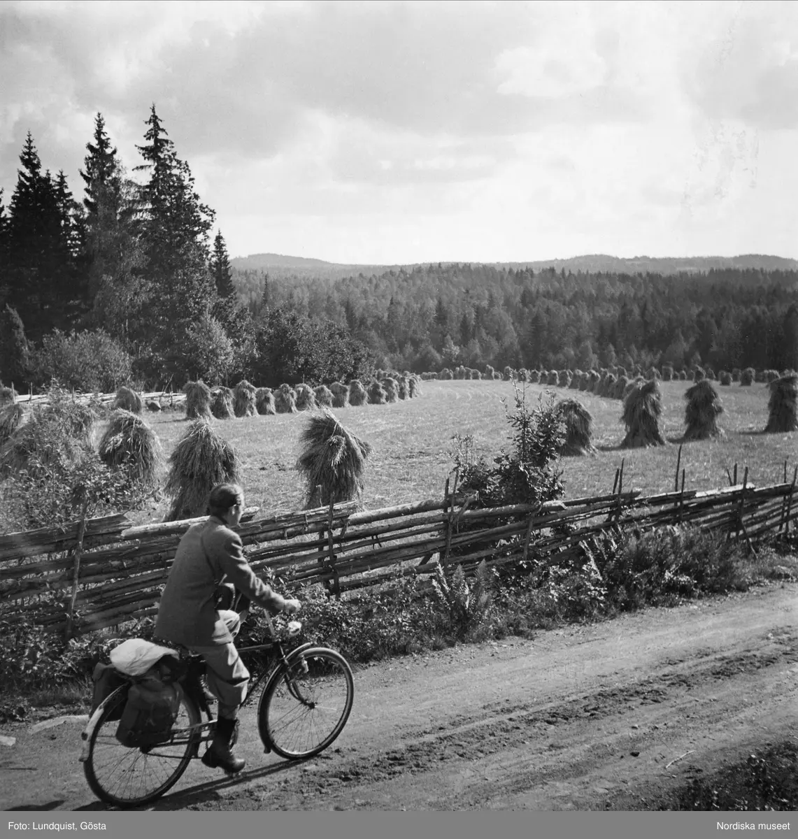 Ensam manlig cyklist på grusväg bredvid gärdesgår och lägda (åker) med många höhässjor.