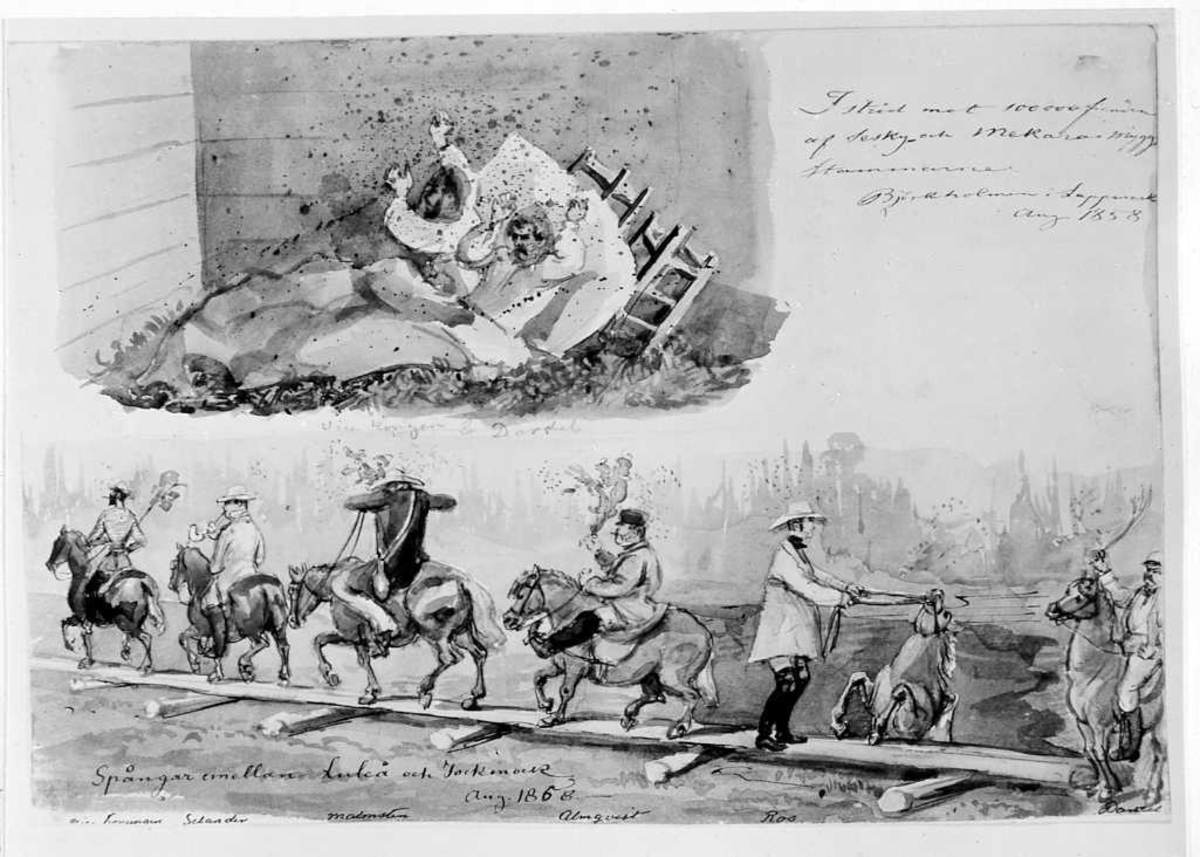 Akvarellerad tuschteckning av Fritz von Dardel. " I Strid med 100 000 fiender...". " Spångar emellan Luleå och Jockmock Aug. 1858".