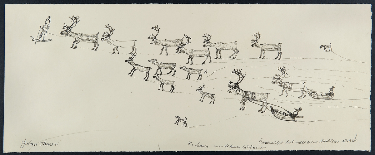 Teckning av Johan Turi. Ur separat lägg 9-19. Renar och akjor. Samer på skidor. L.A. 853. Torne lappmark. Jukkasjärvi socken. Talma sameby.
