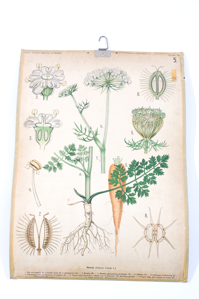 Sveriges kulturväxter. Illustration utförd av Henriette Sjöberg. Botanisk plansch med upphängningskrok. J. Eriksson Botaniska väggtavlor. 3:e upplagan. Ny serie. Tavla 5. Morot (Daucus Carota L.). Detaljerade beskrivningar av morotens olika delar och stadier.