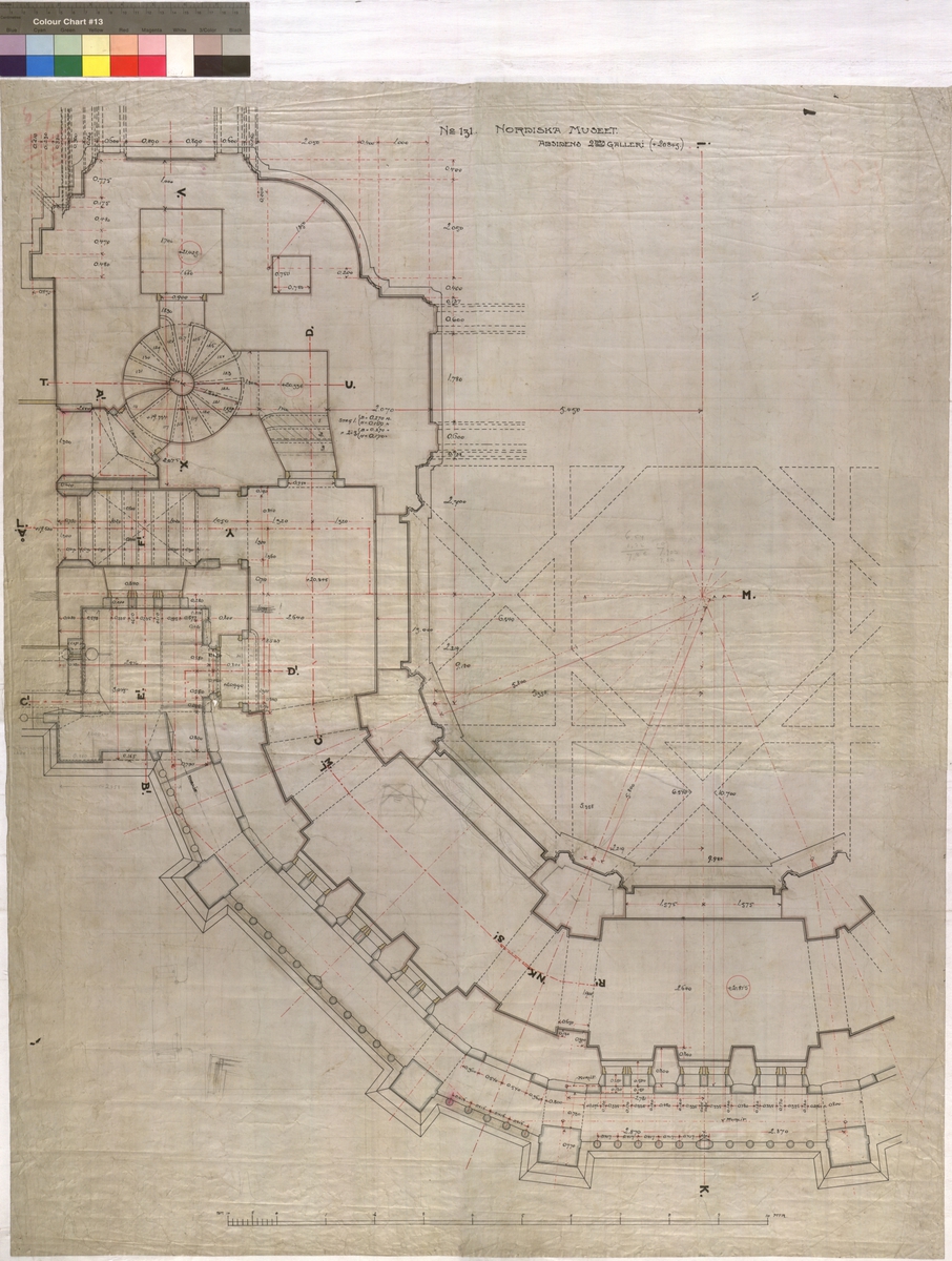 Ritning på väv över Nordiska museets huvudbyggnad. Absidens andra galleri. Plan. Absiden, 2:a galleriet. 95x76,5 cm. Tusch, rött, blått, brunt och gult. Linjalritning. Osignerad.