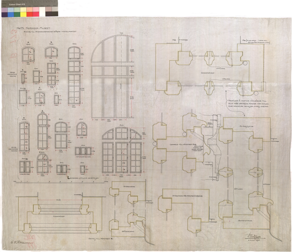 fönsterkarmar och bågar i mittenpartiet. Vägg eller spröjs. Losholz. Droppnäsa. Stendager. Karmdager. Överstycke. Lättlucka. Bottenstycke. Konstruktion. Fönster och mittenparti. 82x102,5 cm. Tusch och rött. Linjalritning. I Gust Clason 2 mars 1904. C V Petterson.