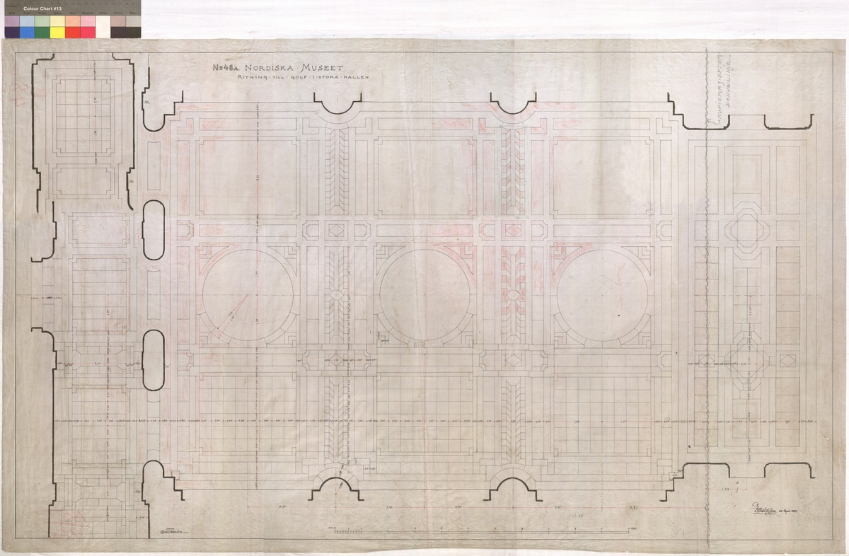 Ritning på väv över Nordiska museets huvudbyggnad. Ritning till golv i Stora hallen. Plan. Stengolv, stora hallen. 76x 126 cm.Tusch, brun krita, svart och rött. Linjalritning. I Gust Clason 25 april 1899. Gust Améen