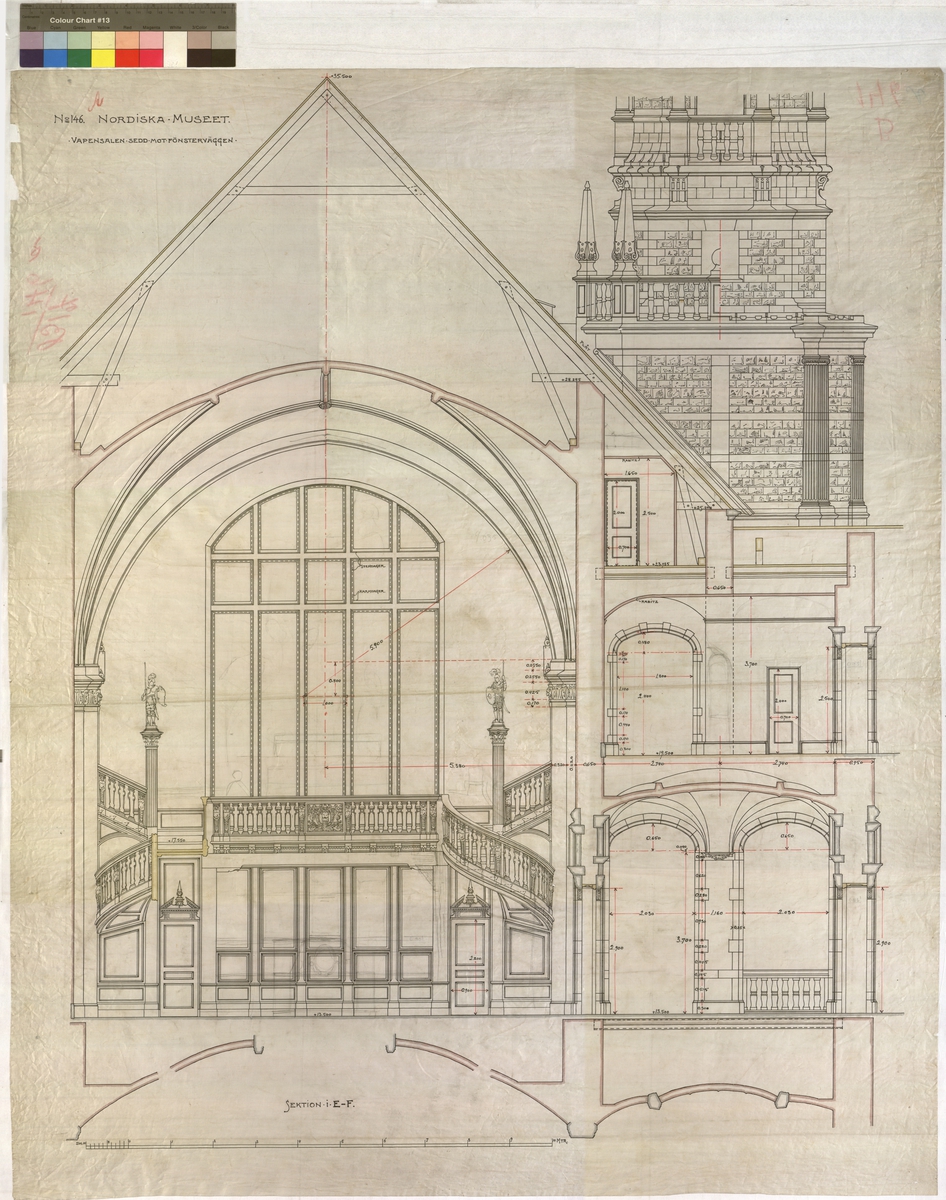 Ritning på väv över Nordiska museets huvudbyggnad. Vapensalen sedd mot fönsterväggen. Fasad, sektion. Kröningsläktaren, vapensalen. Tusch, rött, gult, grått och brunt. Linjalritning, fri hand. Osignerad.