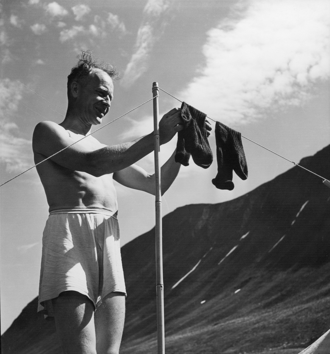Lättklädd man hänger strumpor på tork. Fjällandskap i bakgrunden.