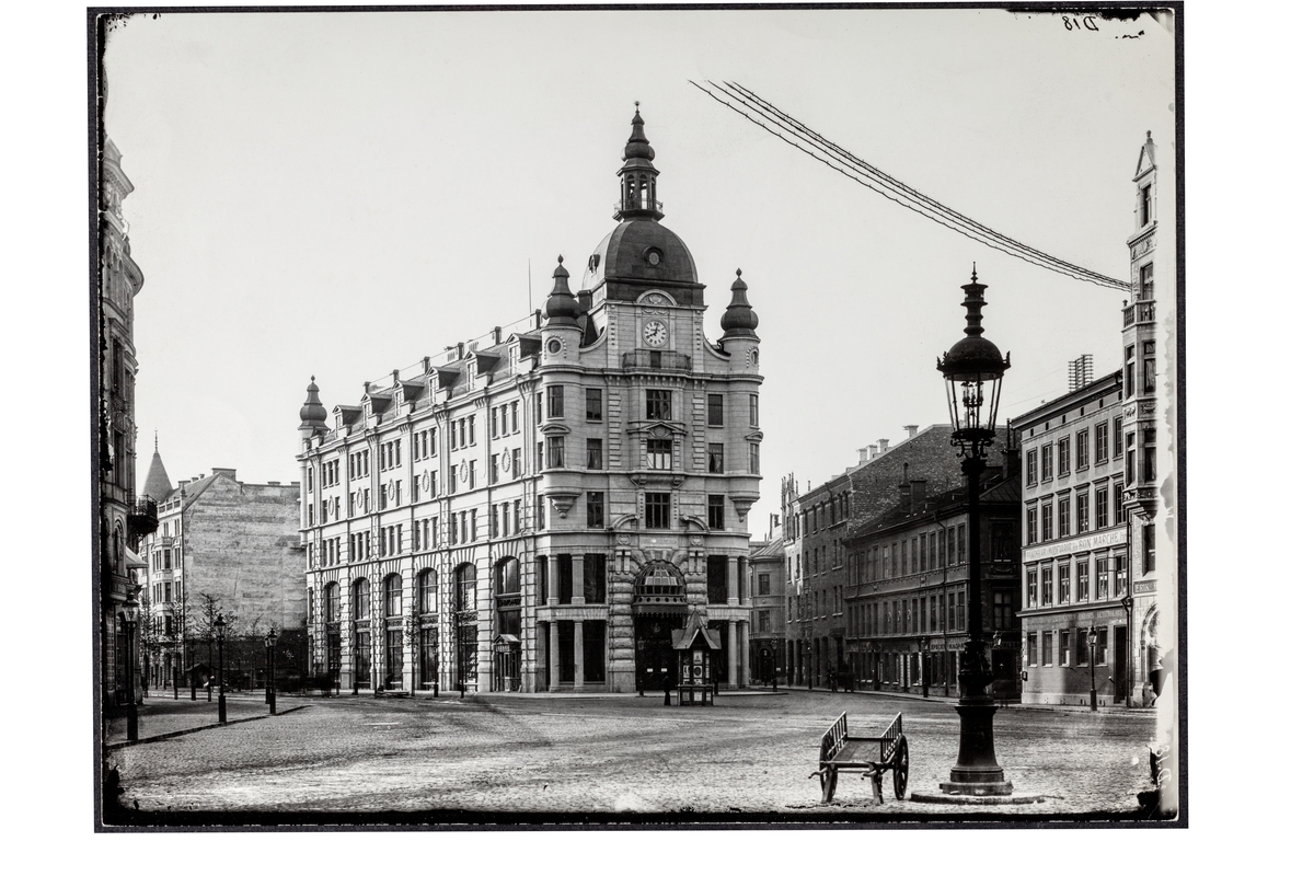 Stadsbild från Stureplan i Stockholm. Byggnaden är Stureplan 3, ritad av Erik Josephson, där KM Lundbergs varuhus, då Stockholms största detaljhandelsföretag, flyttade in 1898. Företaget ombildades 1902 till Nordiska Kompaniet (NK) som hade sina lokaler i huset fram till 1915 då man flyttade till Hamngatan.