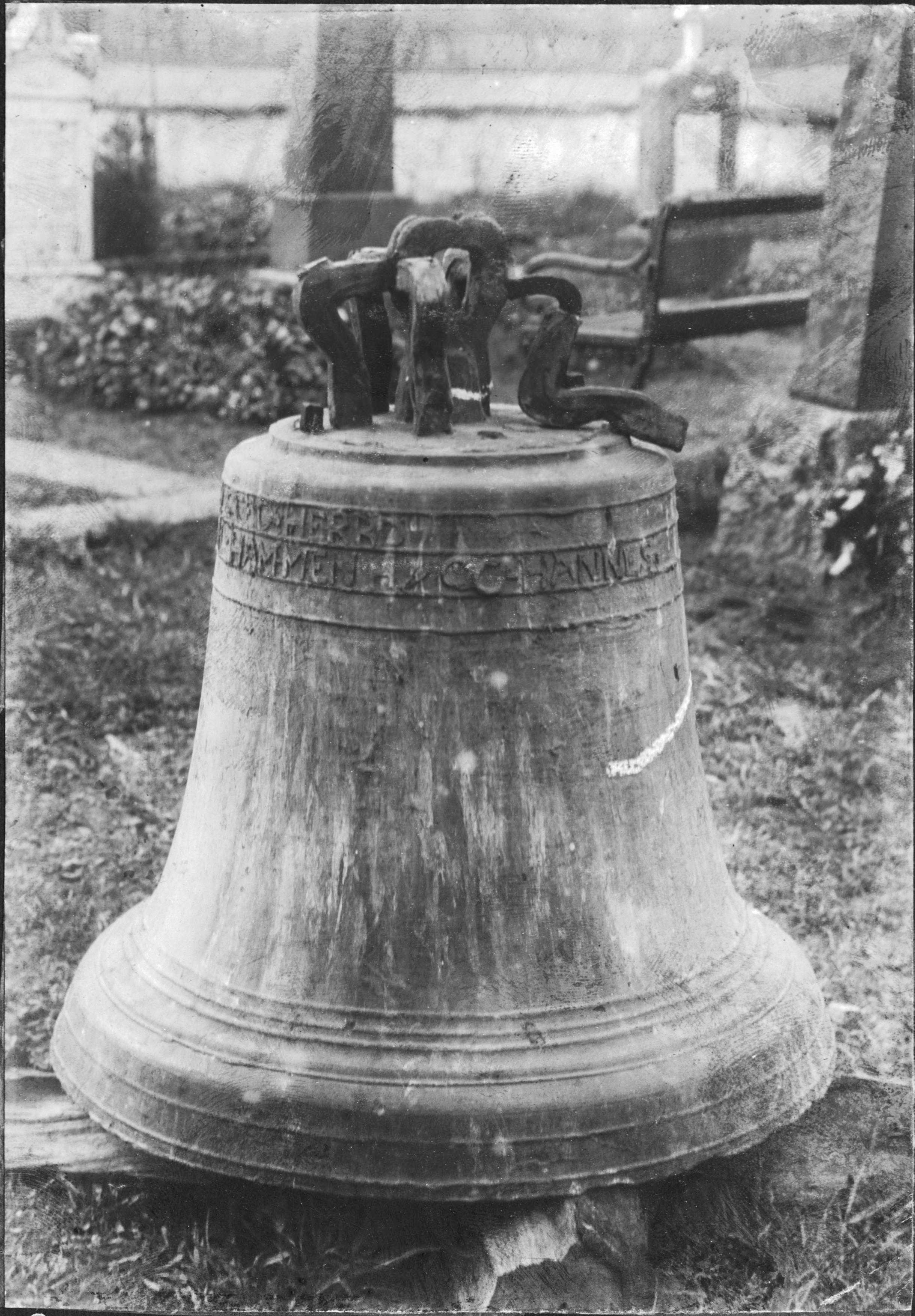 Lillklockan av malm, åtta randlister i fyra avdelningar, med årtalet 1738 enligt inskription.