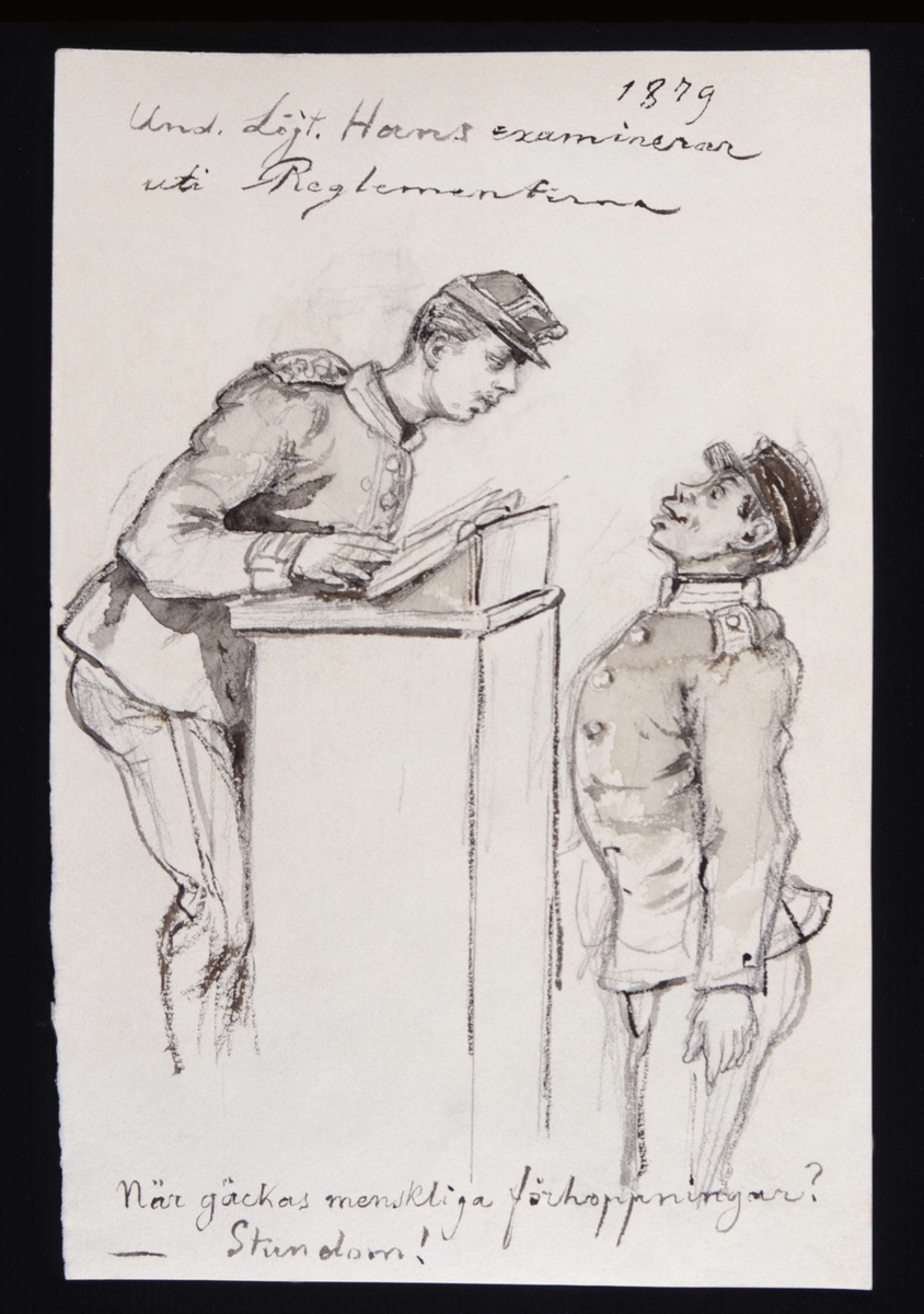 "Und. Löjtnant Hans examineras uti Reglementerna. När gäckas menskliga förhoppningar? Stundom." Tuschteckning av Fritz von Dardel, 1879.