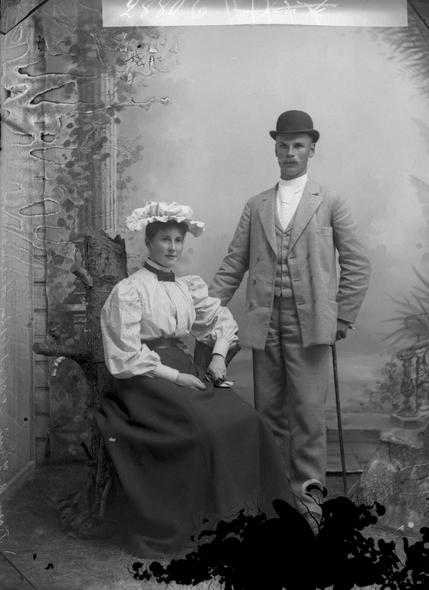 "Far och mor ... Tullinge? 1916?" Ateljéporträtt av ett par.
