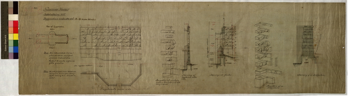 till byggnadens nordvästra del. Plan. Fasad. Perspektiv exteriör. Sockel, Trapptorn. Strävpelare. 33x115,5 cm. Tusch, rött. Linjalritning. Fri hand. Osignerad.