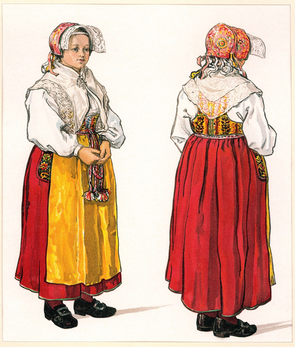 Folkdräkt, kvinna. Festdräkt för gift kvinna, Gagnef socken, Dalarna. Bildtryck efter akvarell av Emelie von Walterstorff.