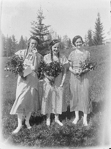Grupporträtt av tre flickor, studenter, i utomhusmiljö. Lima, Dalarna