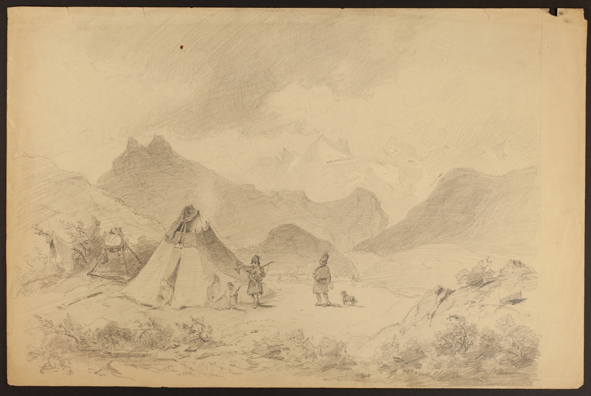 Teckning. Sommarviste. Familj vid sin kåta, vy över fjäll. L.A. 1657. Sannolikt av P Holm under resa i Jokkmokks socken 1861.