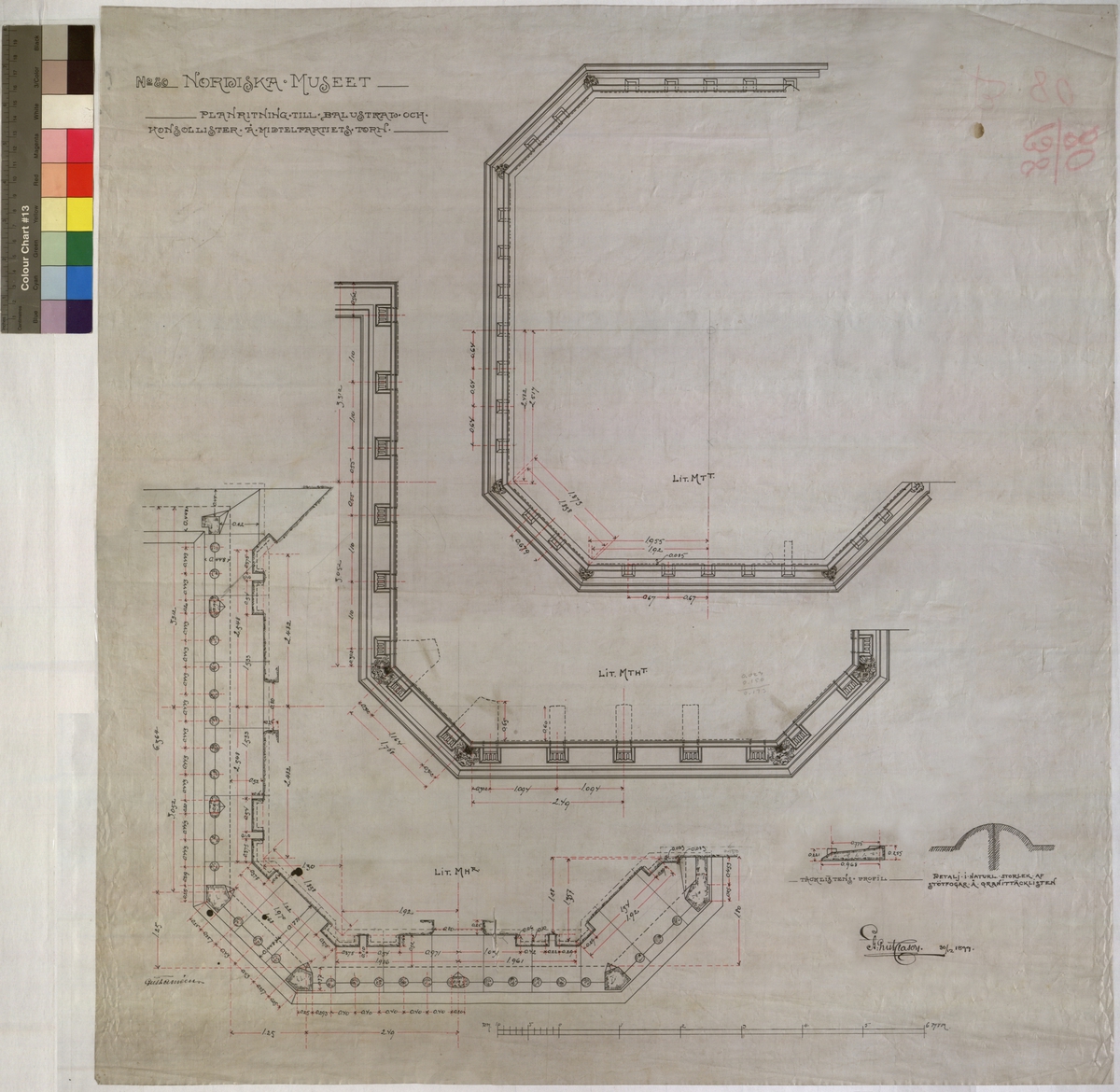 Ritning på väv över Nordiska museets huvudbyggnad. Planritning till balustrad och konsollister för mittenpartiets torn. Plan, Fasad. Stora portens trapptorn. 71x67 cm. Tusch, rött. Linjalritning, fri hand. I Gust Clason 30/12 1899. Gust Améen.