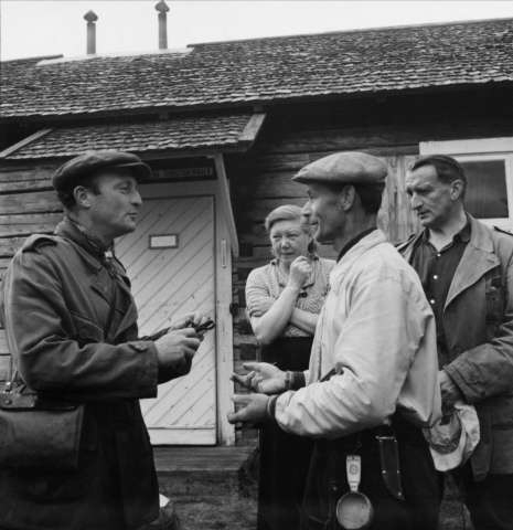 Tre män och en kvinna samtalar utanför turiststation. De två männen närmast i bild bär keps. En av dem har slidkniv och kåsa i bältet. Sommar.