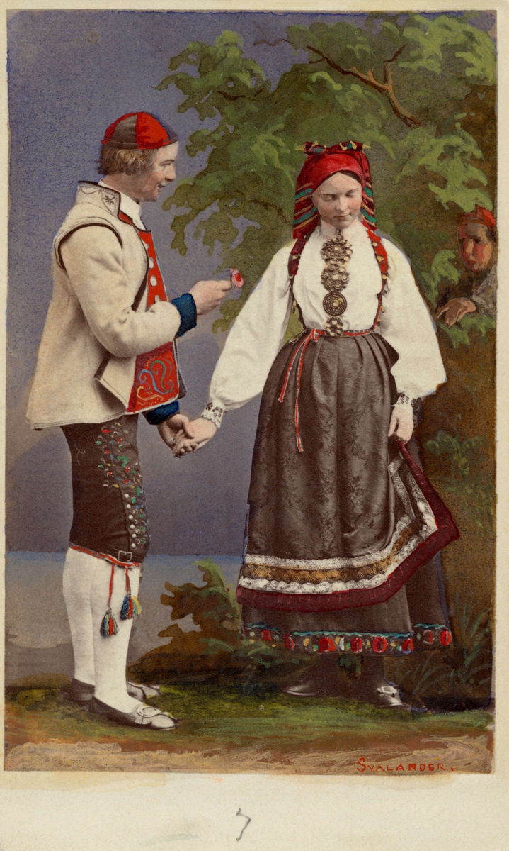 Dräktdockor med huvuden skulpterade av C A Söderman, visade på världsutställningen i Paris 1867. Man och kvinna i dräkter från Telemarken, Norge. Handkolorerad.