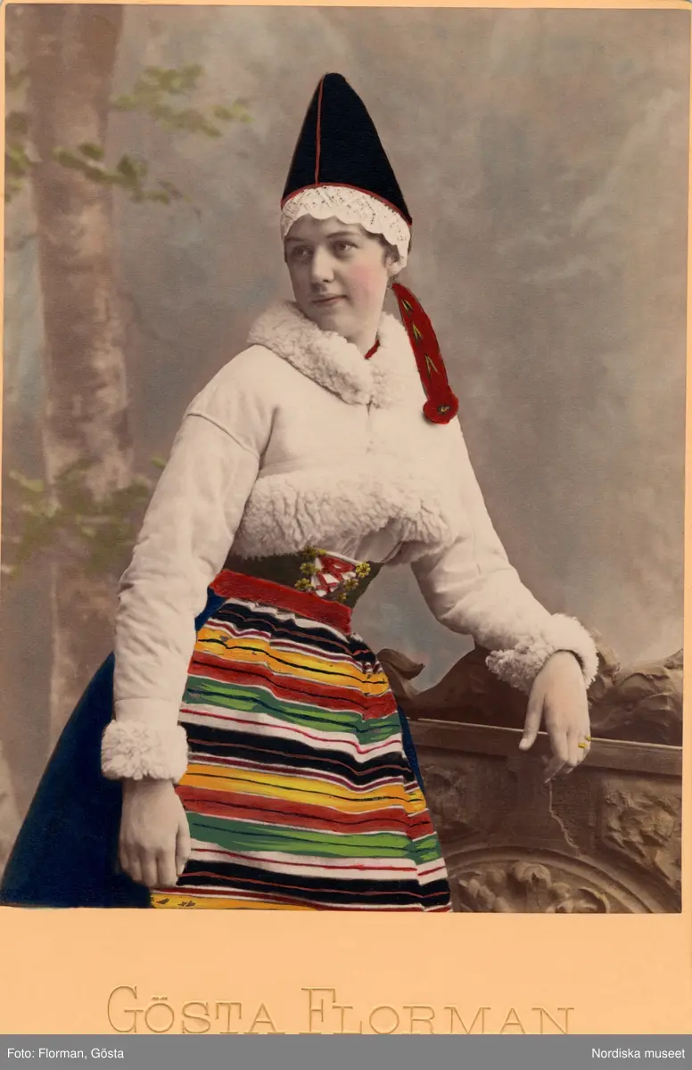 Ung kvinna poserar i folkdräkt från Rättvik i Dalarna. Kolorerat porträttfotografi.