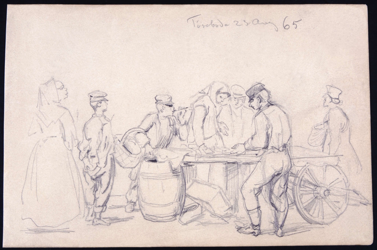 Marknad i Töreboda 23 augusti 1865. Blyertsteckning av Fritz von Dardel