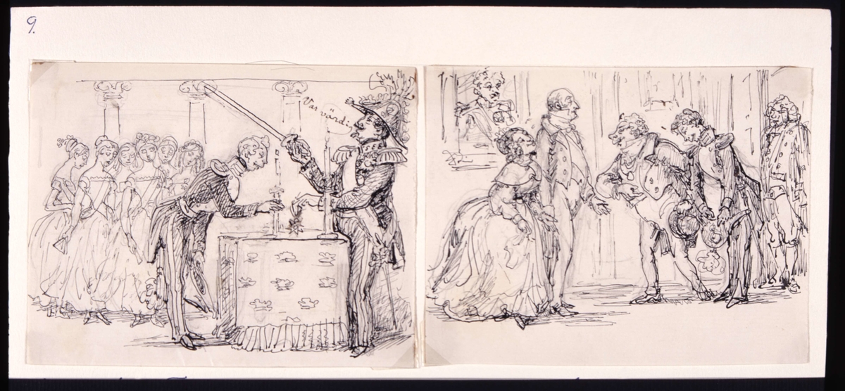 Ur "Sparfs äventyr". En utmärkelse, Sparf får en medalj. Tusch av Fritz von Dardel, 1840