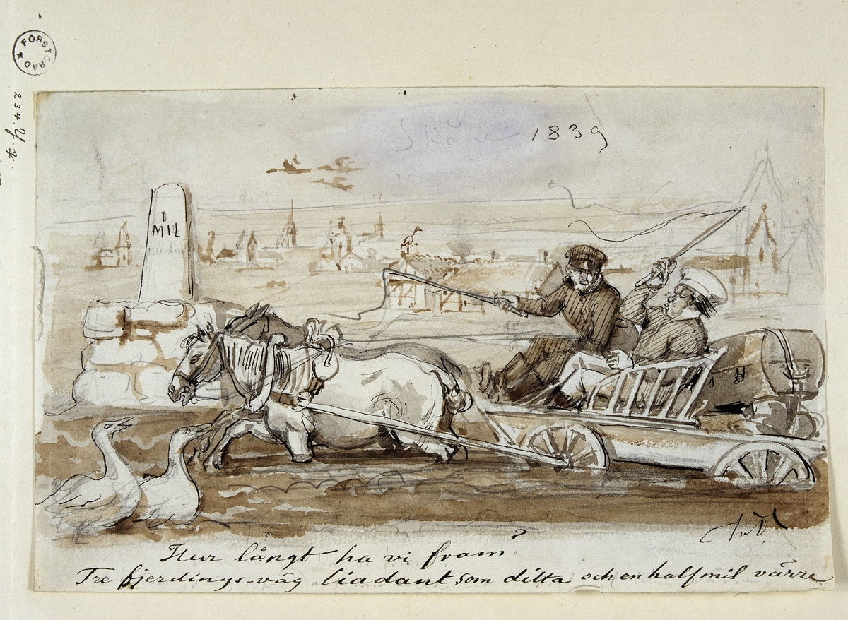 Teckning av Fritz von Dardel daterad 1839 med texten "Hur långt ha vi fram?". Två män i en hästdragen kärra med lera upp till hjulnaven. Nordiska museet inv.nr. 67.481